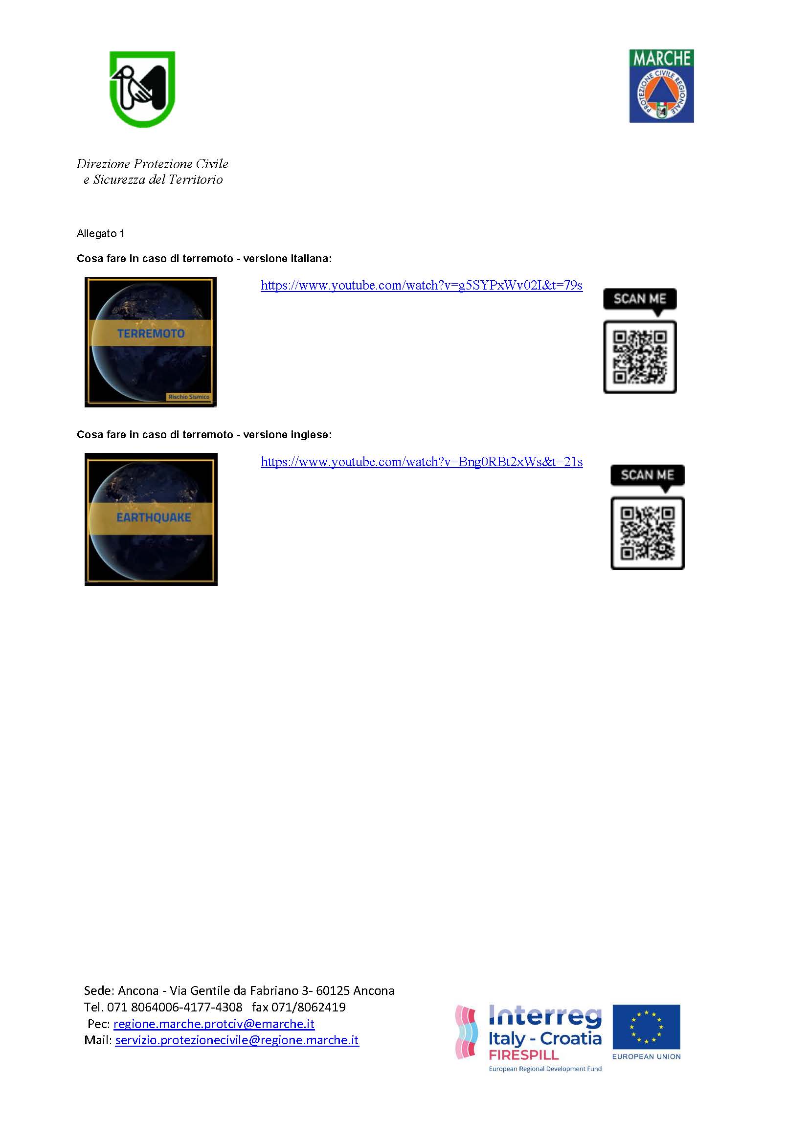 La Direzione Protezione Civile della Regione Marche, all’interno del “Programma di Cooperazione transfrontaliera Italia-Croazia”, ha partecipato ad un progetto, denominato Firespill che ha previsto, tra le varie attività, la realizzazione di materiali volti a favorire una maggiore consapevolezza della cittadinanza sul rischio terremoto.